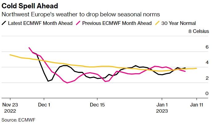 Суровая зима может сделать континент более уязвимым перед любыми дальнейшими сокращениями поставок после того, как летом Россия сократила большую часть поставок по газопроводам. Сжиженный природный газ помог восполнить недостающие поставки и наполнить резервуары, но его запасы начинают сокращаться. Цены на газ в четыре раза выше, чем обычно для этого времени года, что подпитывает инфляцию и наносит ущерб экономике.