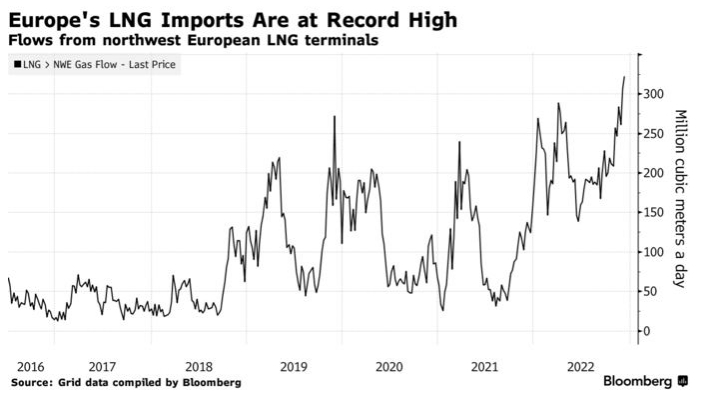 Импорт СПГ уже находится на рекордно высоком уровне, помогая европейцам отапливать свои дома после того, как Россия была вынуждена резко ограничить поставки трубопроводного газа от исторически нормального уровня. Американский СПГ заполнил большую часть пробелов, и в следующем году в Европе откроется больше импортных терминалов.