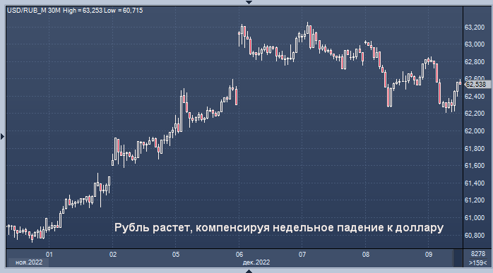 Российская валюта растет по отношению к доллару США, сдерживая третье недельное падение подряд, и приближается к второй неделе потерь по отношению к юаню. Рубль вырос на 0,7% на московских торгах до 62,3375/$, сократив недельное падение до 0,5%.