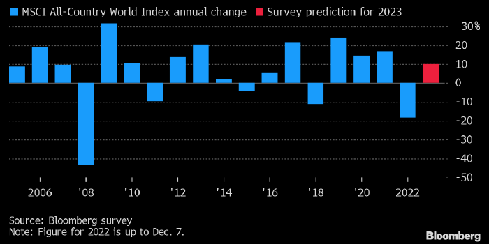 Процентное годовое изменение фондового индекса MSCI All-Country World Index (голубым) и средний прогноз на 2023 год участников опроса, проведенного Bloomberg News (красным). Источник: Bloomberg