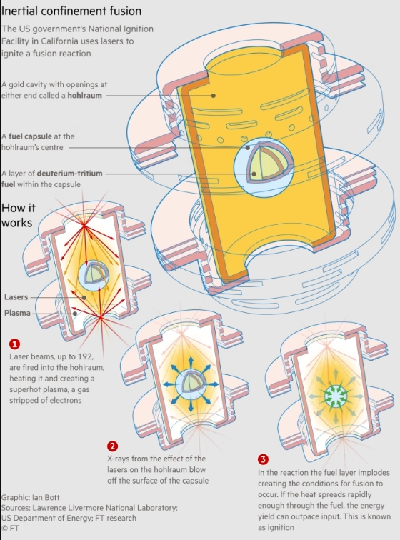 Федеральная Ливерморская национальная лаборатория Лоуренса в Калифорнии, которая использует процесс, называемый термоядерным синтезом с инерционным удержанием, который включает бомбардировку крошечной гранулы водородной плазмы самым большим в мире лазером, добилась чистого прироста энергии в эксперименте по термоядерному синтезу за последние две недели.