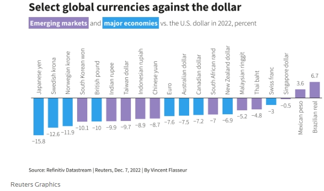 Захватывающий дух скачок курса доллара США растоптал иностранные валюты, увеличил прибыль корпораций и подарил инвесторам одну из немногих выигрышных сделок в этом году. Хотя доллар в последние недели сильно упал, опасения по поводу рецессии могут удержать его на высоком уровне в 2023 году.
