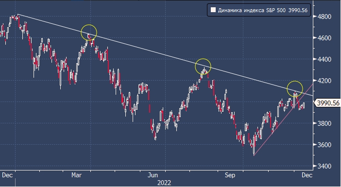 Индекс в декабре не смог пробить линию сопротивления, построенную от максимумов 2022 года, затем опустился ниже ключевого уровня 4100 пунктов и опустился ниже линии поддержки, построенной от минимумов октября. Меж тем индекс остается выше 100-дневной скользящей средней линии, хотя и не может закрепиться выше 200-дневной МА с текущим значением на 4035 пунктов.