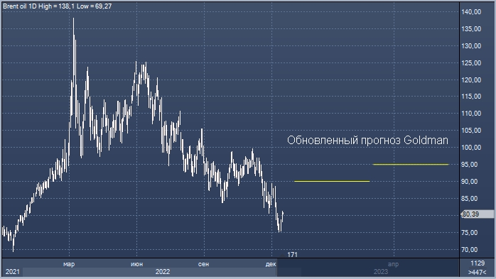 Goldman Sachs снизил свои прогнозы по нефти марки Brent на 1 квартал и 2 квартал 2023 года до 90 и 95 долларов за баррель соответственно. Предыдущий прогноз подразумевал в обозначенные периоды цены на уровне 110 долларов за баррель.