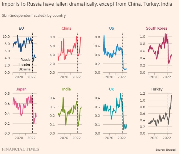 Россия засекретила данные о своем импорте вскоре после начала СВО, но экономисты строят картину, используя информацию об экспорте в Россию от ее основных торговых партнеров. Это показывает резкий спад весной, сразу после начала СВО России в Украине, за которым последовало некоторое восстановление ближе к осени.