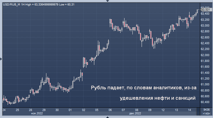 "Ключевую роль в динамике счета текущих операций играет торговый баланс - его сальдо за прошедшие месяцы IV кв. в среднем сократилось до $16 млрд против $22,7 млрд, - пишут эксперты. - В декабре с учетом вступления в силу санкционных ограничений на экспорт российской нефти тенденция продолжится - нефтяное эмбарго со стороны ЕС напрямую ограничивает физические объемы поставок, а введение ценового потолка может повлиять на поставки в третьи страны, усложнив процесс транспортировки. На этом фоне, в первой половине декабря курс рубля ослаб к уровню 63 руб./$1 после 60-61 руб./$1 в ноябре".