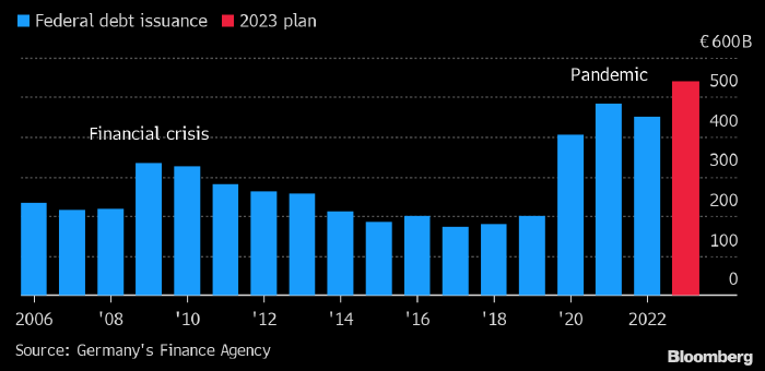 Согласно опубликованному в среду плану немецкого финансового агентства, эмиссия долговых обязательств ФРГ вырастет в 2023 году примерно до 539 млрд евро (573 млрд долларов) с 449 миллиардов евро в этом году. Предыдущий рекорд был поставлен в 2021 году, когда правительство страны не стеснялось в расходах, чтобы бороться с последствиями пандемии коронавируса.