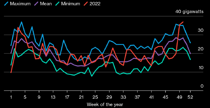 Средненедельная выработка электроэнергии на газовых электростанциях Центральной Европы: в 2022 году (красным), максимальный показатель за последние пять лет (голубым), медианный показатель за последние пять лет (фиолетовым) и минимальный показатель за последние пять лет (салатовым). Горизонтальная шкала — соответствующие недели года. Источник: Bloomberg