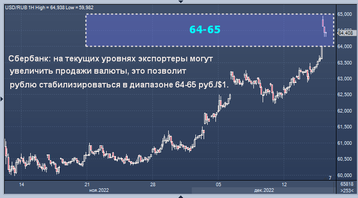 Эксперты Сбербанка также считают, что на текущих уровнях экспортеры могут увеличить продажи валюты, это позволит рублю стабилизироваться в диапазоне 64-65 руб./$1.
