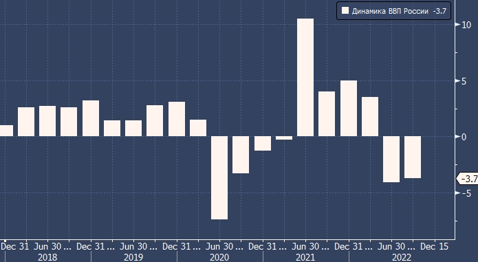 "Как сообщил Росстат, ВВП сократился на 3,7% г/г в третьем квартале 2022 после падения на 4,1% г/г во втором квартале 2022 и роста на 3,5% г/г в первом квартале 2022. Таким образом, в целом экономика сократилась на 1,6% г/г за первые девять месяцев этого года.