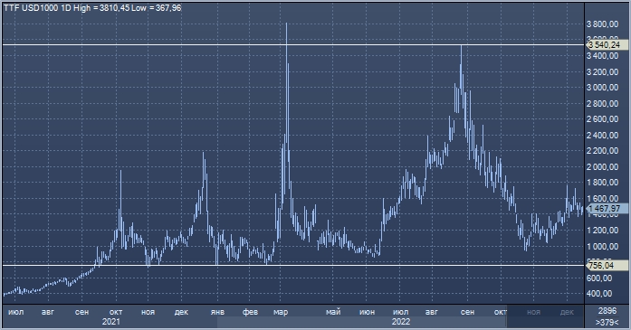 График цены ближайшего фьючерса на спотовый индекс газа TTF на бирже ICE Futures (в долларах США за тысячу кубометров) интервалами в 1 день