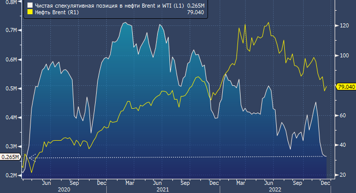 На неделе до 13 декабря крупные спекулянты, вроде хедж-фондов, сократили совокупную чистую длинную позицию в нефти Brent и WTI на 3 013 фьючерсных и опционных контрактов до 264 736 контрактов, сообщила в пятницу, 16 декабря, американская Комиссия по торговле товарными фьючерсами (CFTC). Это — самое низкое значение за два с половиной года.