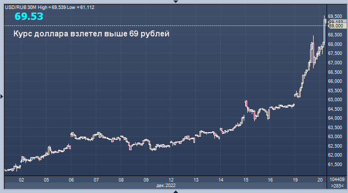 Рубль сильно дешевеет к доллару и евро, обновляя минимумы с середины мая второй день подряд, так как игроки рынка отыгрывают ожидаемое снижение нефтегазовых доходов и ухудшение показателей внешнеторгового баланса. Накануне страны ЕС достигли соглашения по установлению лимита цен на газ, который начнет действовать с 15 февраля. Ранее в декабре вступил в действие "потолок" цен на нефть. Дополнительный спрос на валюту может быть связан также с сезонным фактором, в том числе, с покупкой валюты населением перед новогодними каникулами, полагают аналитики.