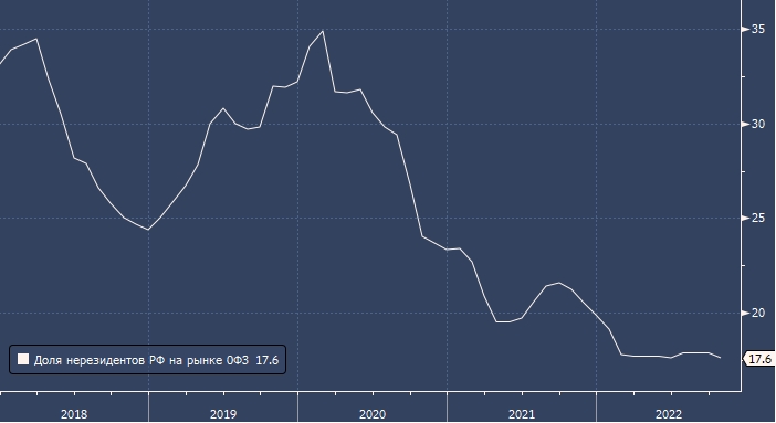 Доля нерезидентов на рынке ОФЗ стабилизировалась на уровне чуть менее 18%, достигнув 2,7 триллиона рублей (39 миллиардов долларов) в октябре, согласно данным ЦБ России.
