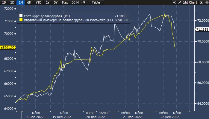 Текущая бэквордация (более низкое значение фьючерса относительно базы, то есть спотового курса) составляет порядка 2 000 пунктов (в пунктах фьючерса). О чем это говорит? О стойкой уверенности участников срочного рынка в том, что на момент поставки валюты ее курс будет ниже текущего наличного курса (71.55 рубля за доллар). То есть, продавая сейчас фьючерс по 69,50, поставщик валюты в марте уверен в том, что наличный курс в этом месяце окажется ниже текущей котировки спота.