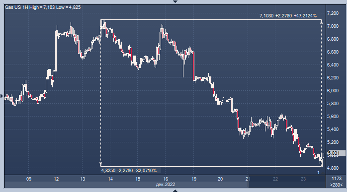 Фьючерсы на природный газ падают не первый день в преддверии рождественских праздников, оказавшись ниже отметки в 5 долларов США впервые с конца октября. Дело в том, что долгосрочные прогнозы предсказывают теплую погоду, даже несмотря на то, что мощный зимний шторм принес сильные морозы на большую часть территории Соединенных Штатов. Национальная метеорологическая служба отмечает, что предупреждения о резком похолодании теперь охватывают штаты с общим населением 200 миллионов человек.