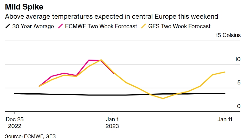 По данным Maxar Technologies Inc., при максимальной температуре 16 градусов по Цельсию (61 градус по Фаренгейту) во Франкфурте в канун Нового года будет более чем на 10 градусов выше среднего значения за 30 лет. В Хельсинки будет на 6,2 градуса выше нормы в субботу, а Марсель достигнет 17,5 градусов, так как южная Европа продолжает наслаждаться теплой зимой.