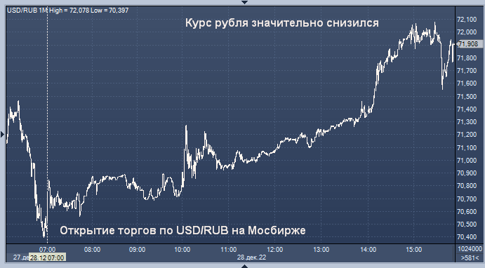 Рубль активно дешевеет после завершения налогового периода декабря и перед новогодними каникулами. Участники рынка отыгрывают подписание президентом РФ Владимиром Путиным указа о запрете продавать российские нефть и нефтепродукты по контрактам с "потолком цен", а также возобновление с января 2023 года действия бюджетного правила. Министр финансов РФ Антон Силуанов сообщил вчера, что его ведомство, возможно, уже в январе начнет продавать рубль за китайскую валюту для пополнения Фонда национального благосостояния на основе оценки помесячного выполнения годового ориентира поступлений нефтегазовых доходов в 8 трлн рублей.
