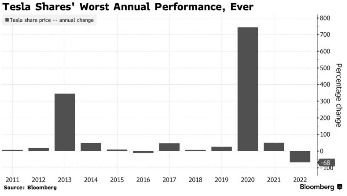 Только в декабре Tesla упала более чем на 42%, в результате чего в этом году она потеряла 68%, что свидетельствует о радикальном изменении лица для акций, которые выросли в эпоху низких ставок пандемии.