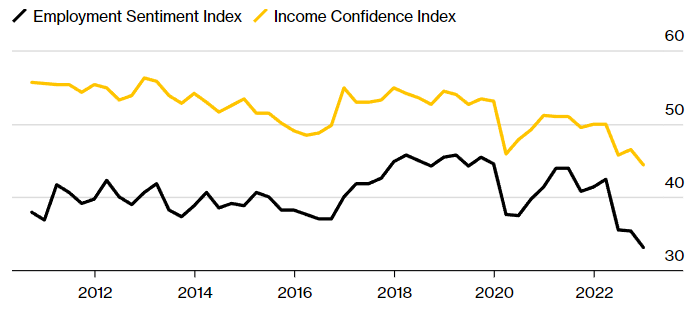 Китай: индекс настроений на рынке труда (черным) и индекс уверенности потребителей в своих доходах (желтым). Источник: Bloomberg