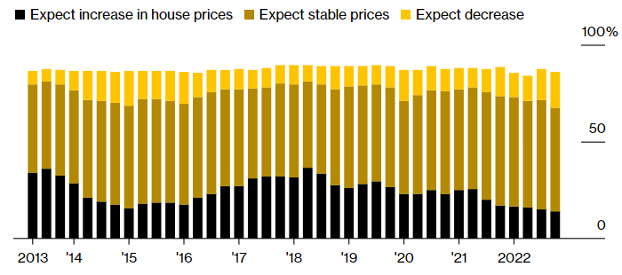 Процент респондентов, ожидающих роста цен на жилье (черным), сохранения их на текущем уровне (темно-желтым) и из роста (светло-желтым). Источник: Bloomberg