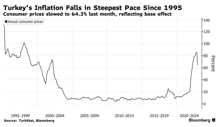 Инфляция в Турции падает самыми быстрыми темпами с 1995 года | Потребительские цены в прошлом месяце снизились до 64,3%, отражая эффект базы.