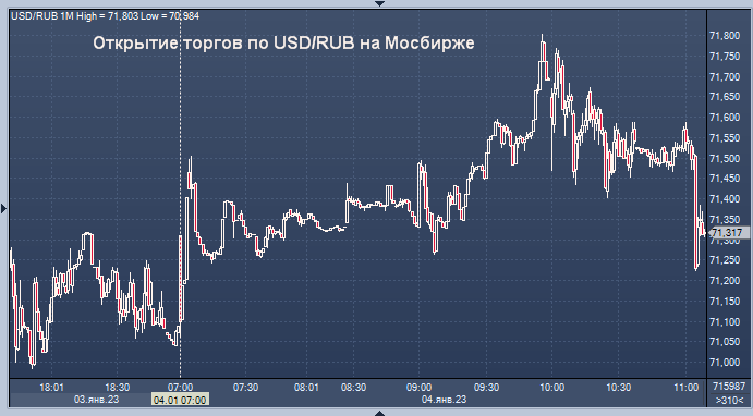Курс доллар/рубля на Мосбирже интервалами в 1 минуту