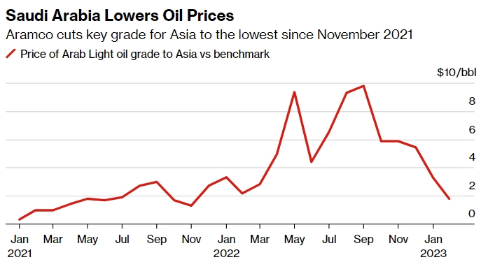 Саудовская Аравия снижает цены на нефть. Aramco снижает цену для Азии до самого низкого уровня с ноября 2021 года. Источник: Saudi Aramco, Bloomberg