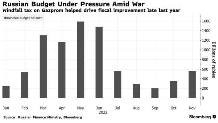 Бюджет России все больше сжимается по мере того, как СВО продолжается уже 11-месяц, а экономика сокращается из-за широкомасштабных санкций США и Европы. Дивиденды и налог на непредвиденные расходы, выплаченные ПАО «Газпром», уже помогли увеличить профицит бюджета в конце прошлого года, прежде чем большие обязательства по расходам в декабре, вероятно, привели к дефициту бюджета.