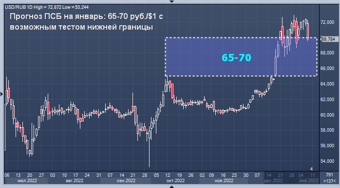 "Поддержку национальной валюте будет оказывать отмена ковидных ограничений в Китае, которая благоприятно влияет на конъюнктуру на нефтяном рынке. Наш ориентир - диапазон 65-70 руб./$1 с возможным тестом нижней границы", - отмечают эксперты в комментарии.