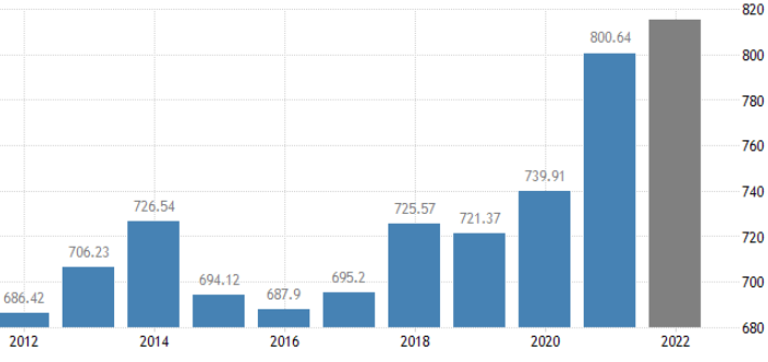 ВВП Швейцарии в млрд долларов США. Данные: Всемирный банк, источник: TradingEconomics