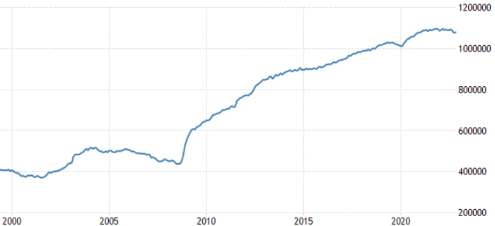 Денежный агрегат М2 Швейцарии в млн франков. Данные: ШНБ, источник: TradingEconomics