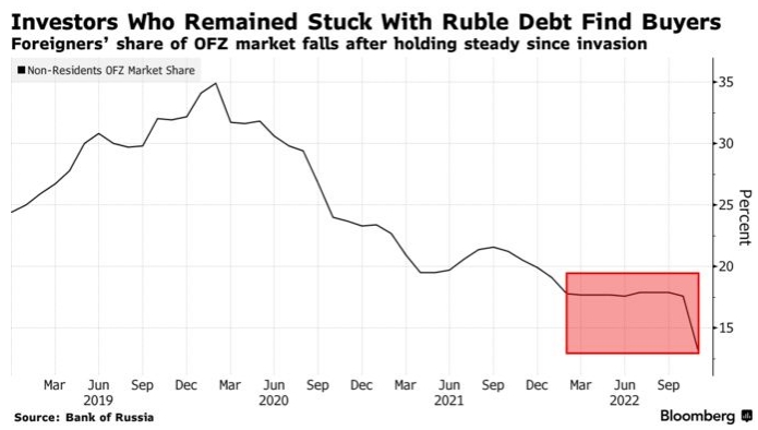 Инвесторы, застрявшие в рублевом долге, находят покупателей | Доля иностранцев на рынке ОФЗ падает после стабильной после начала СВО