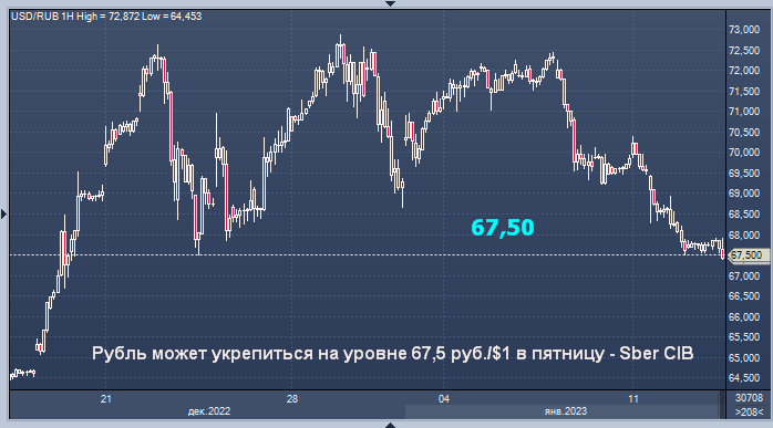 Рубль может укрепиться на уровне 67,5 руб./$1 на торгах в пятницу, поддержку ему будет оказывать глобальное ослабление доллара, связанное с замедлением инфляции в США, считают экономисты Sber CIB.