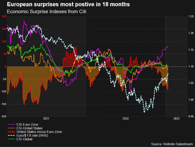 Показывая, насколько поступающие экономические данные уже превышают преобладающую мрачность прогнозов, европейские индексы экономических сюрпризов более позитивны, чем на любом этапе с июля 2021 года, и разрыв между ними и отрицательными эквивалентами в США является самым большим с июня.