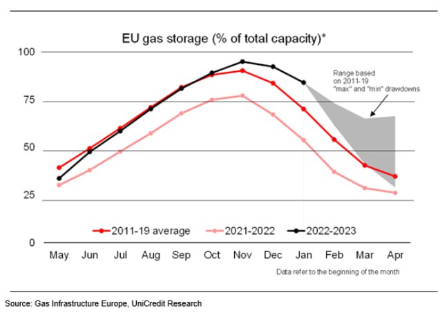 Экономические сюрпризы еврозоны. График Unicredit по хранению газа в ЕС. Цены на природный газ в евро падают