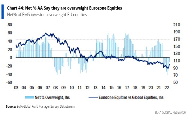 В качестве показателя того, насколько сильно акции еврозоны были обесценены после начала СВО на Украине и связанного с этим энергетического шока, ежемесячный опрос управляющих глобальными фондами Bank of America прошлым летом показал рекордный чистый недовес акций еврозоны, примерно на 2 стандартных отклонения ниже долгосрочных средних значений.