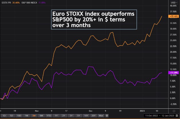 Евро вырос на 14% по отношению к доллару с сентября и уже вырос на 2% в 2023 году до самого высокого уровня с апреля. В долларовом выражении акции в евро превзошли индекс S&P 500 более чем на 20% за последние 3 месяца.