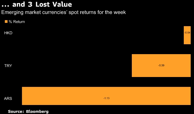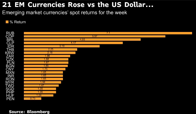 А вот и первые итоги от Bloomberg за неделю: рубль выходит на первое место.