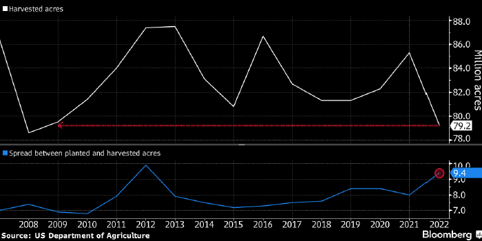 Площадь посевов кукурузы в США в млн акров. Данные: Минсельхоз США, Источник: Bloomberg