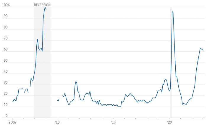 Глобальная инфляция постепенно снижается, однако экономисты по-прежнему ожидают, что в этом году экономика США погрузится в рецессию из-за того, что Федрезерв слишком далеко зашел с повышением ставки. В среднем, опрошенные изданием экономисты оценивают вероятность рецессии в ближайшие 12 месяцев в 61%. Для сравнения: в октябре этот показатель составлял 63%. Это исторически высокий процент для периода вне фактической рецессии.