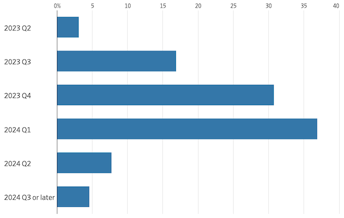 Представители ФРС дали понять, что в этом году ставки снижаться не будут. Экономисты с этим не согласны: 51% ожидают, что ФРС начнет снижать ставки в этом году, хотя ранее такой прогноз давали 60% опрошенных. По мнению 31% экономистов, ФРС начнет снижать ставки в четвертом квартале этого года. Еще 37% ожидают этого в первом квартале 2024 года, а 8% — во втором квартале следующего года.