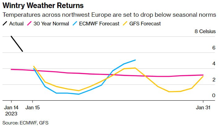 Возвращение зимних условий последовало за рекордно теплым началом года, которое ослабило энергетический кризис в Европе. Мягкие температуры обуздали потребность в отоплении и даже позволили некоторым странам пополнить запасы природного газа в то время, когда они обычно потребляют газ.