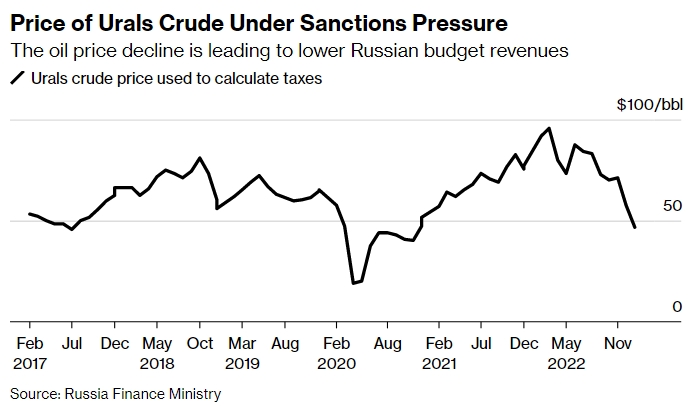В декабре уже сложился рекордный дефицит федерального бюджета на фоне роста военных расходов, в то время как цены на нефть и газ — крупнейший источник государственных доходов — снизились. Основная экспортная цена на российскую нефть снизилась почти вдвое в 2022 году из-за сочетания замедления мировой экономики и волны международных санкций в ответ на СВО.