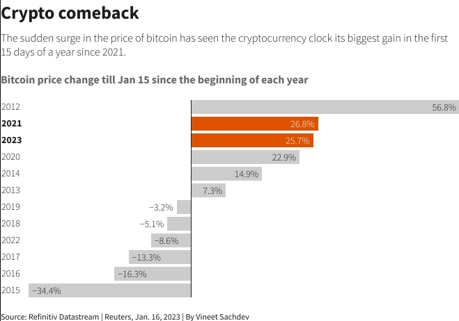 Криптовалюта № 1 в январе выросла на 26%, только за последнюю неделю подскочив на 22%, преодолев уровень в 20 000 долларов и взяв курс на свой лучший месяц с октября 2021 года - как раз перед Большим крипто-крахом.
