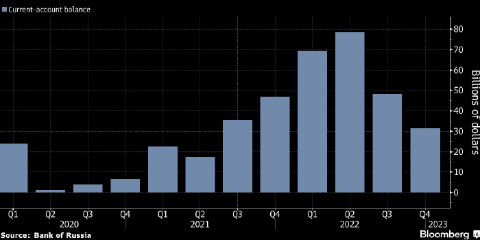 Профицит текущего счета платежного баланса РФ в млрд долларов США. Данные: Банк России, источник: Bloomberg