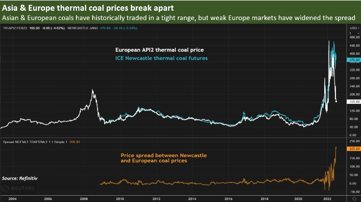 Однако благодаря недавнему падению цен на природный газ в Европе - на 60% с 1 декабря из-за сравнительно высоких зимних температур, заполненных резервуаров для хранения газа и сокращения его промышленного использования - цены на уголь в Европе и спрос на него в 2023 году резко упали.