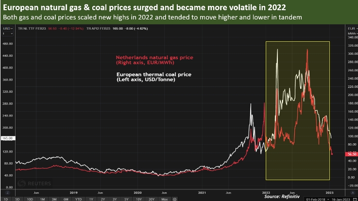 Европейские рынки природного газа и угля стали тесно взаимосвязанными в 2022 году, поскольку коммунальные предприятия и торговые фирмы были вынуждены учитывать прогноз обвального сокращения поставок российского природного газа по трубопроводам, конкурируя за резко более высокие объемы энергетического угля и других видов энергетического топлива.