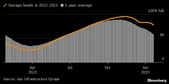 Запасы природного газа в Европе в сезоне 2022–2023 (оранжевая линия) и среднее пятилетнее значение этого показателя (серая гистограмма). Источник: Bloomberg