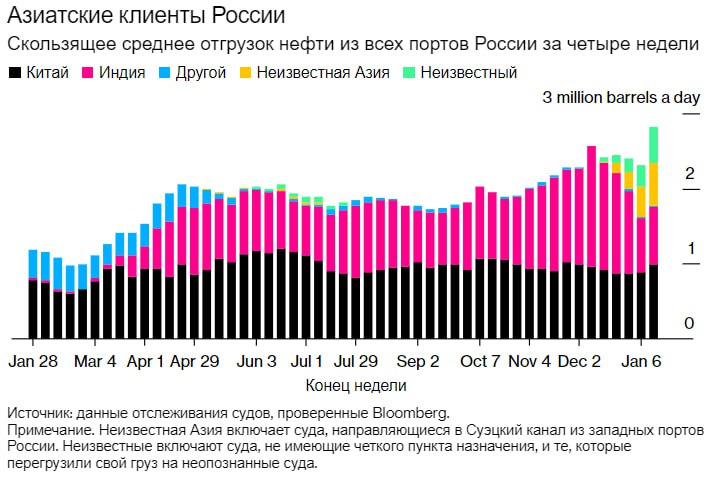 Азиатские клиенты России. Скользящее среднее отгрузок нефти из всех портов России за четыре недели. Источник: данные отслеживания судов, проверенные Bloomberg. Примечание. Неизвестная Азия включает суда, направляющиеся в Суэцкий канал из западных портов России. В неизвестные включают суда, не имеющие четкого пункта назначения, и те, которые перегрузили свой груз на неопознанные суда.